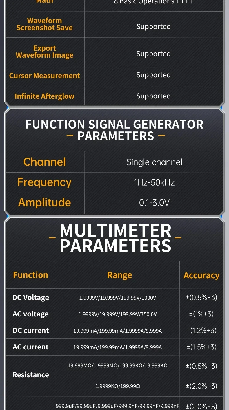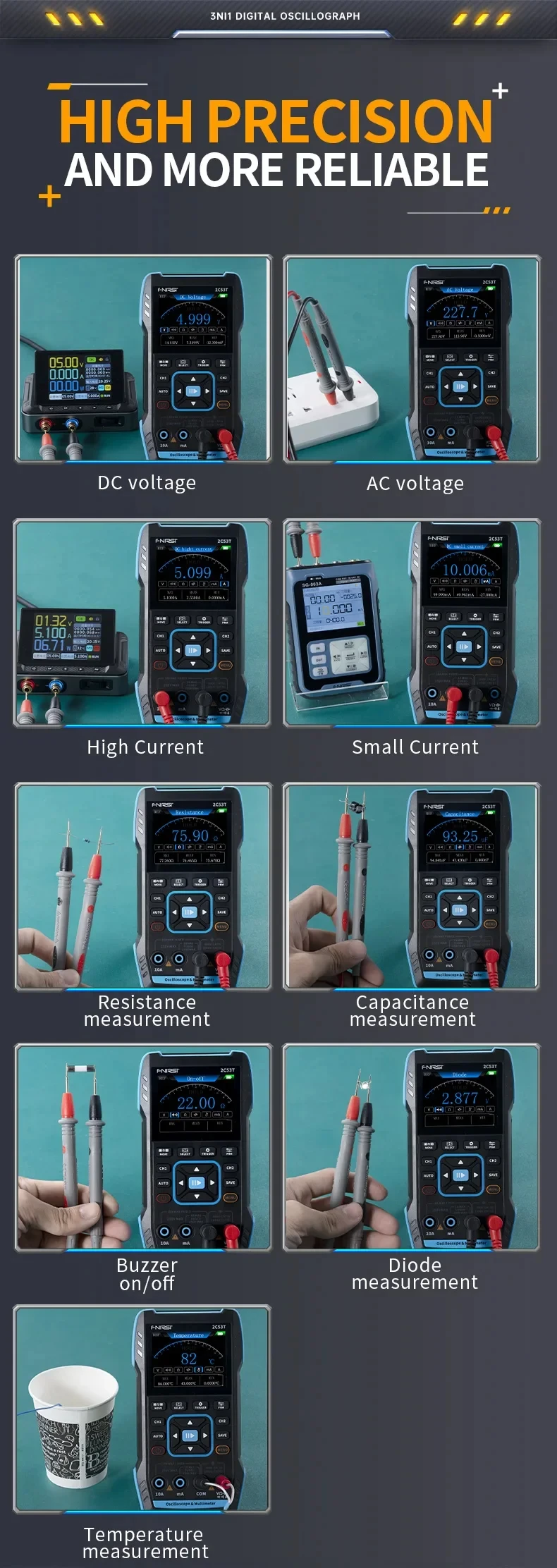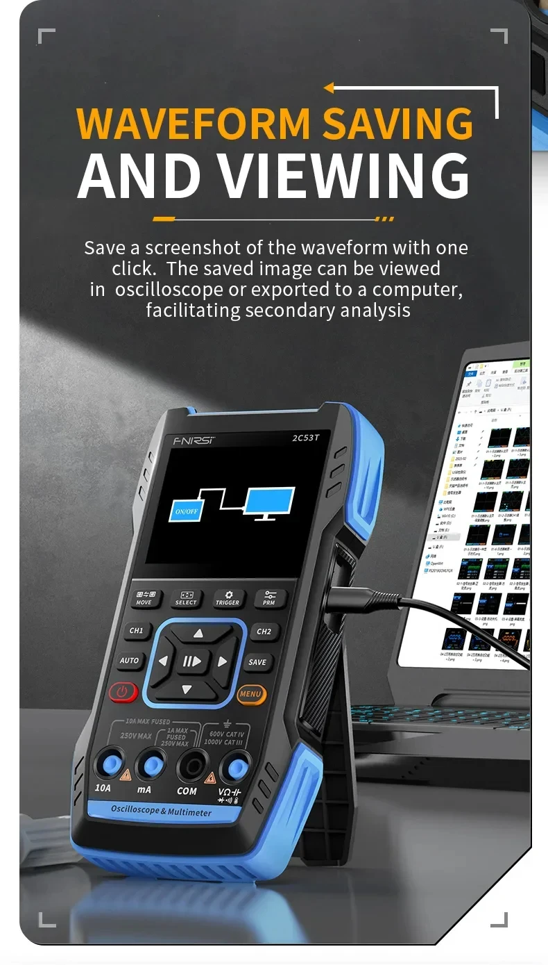 Support for saving and viewing waveform screenshots for analysis .The multimeter has a 4-digit 10000 point true effective value and supports AC/DC voltage and current measurement, as well as capacitance, resistance, diode, on/off and other measurement functions.
