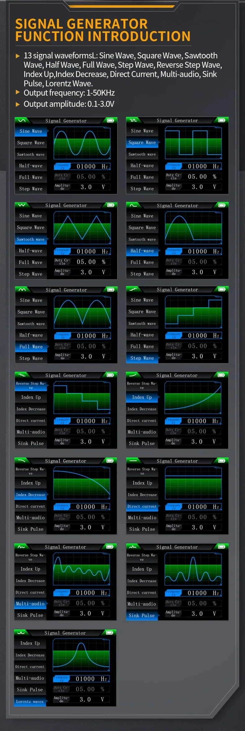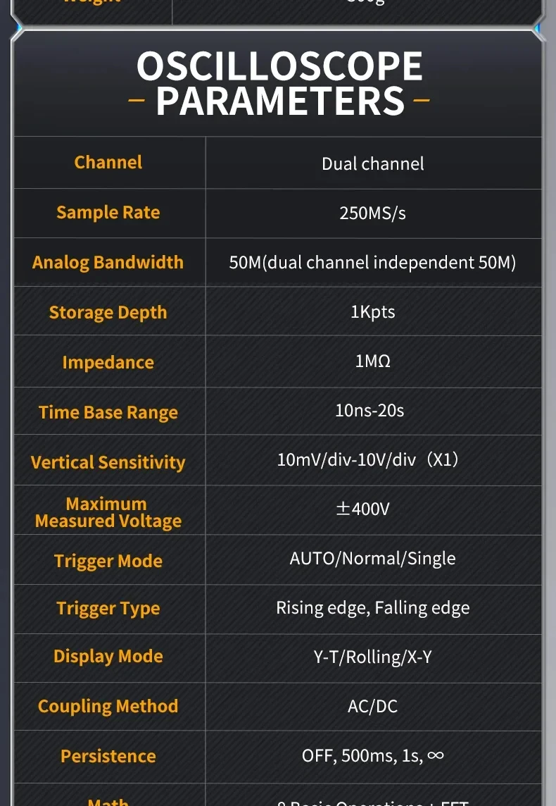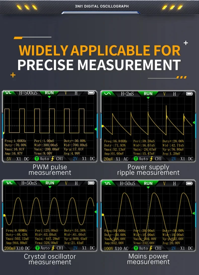 The Oscilloscope adopts FPGA+MCU+ADC hardware architecture, with a sampling rate of 50MS/s, 10Mhz analog bandwidth, built-in high-voltage protection module, maximum support measurement of peak voltage of ± 400V;