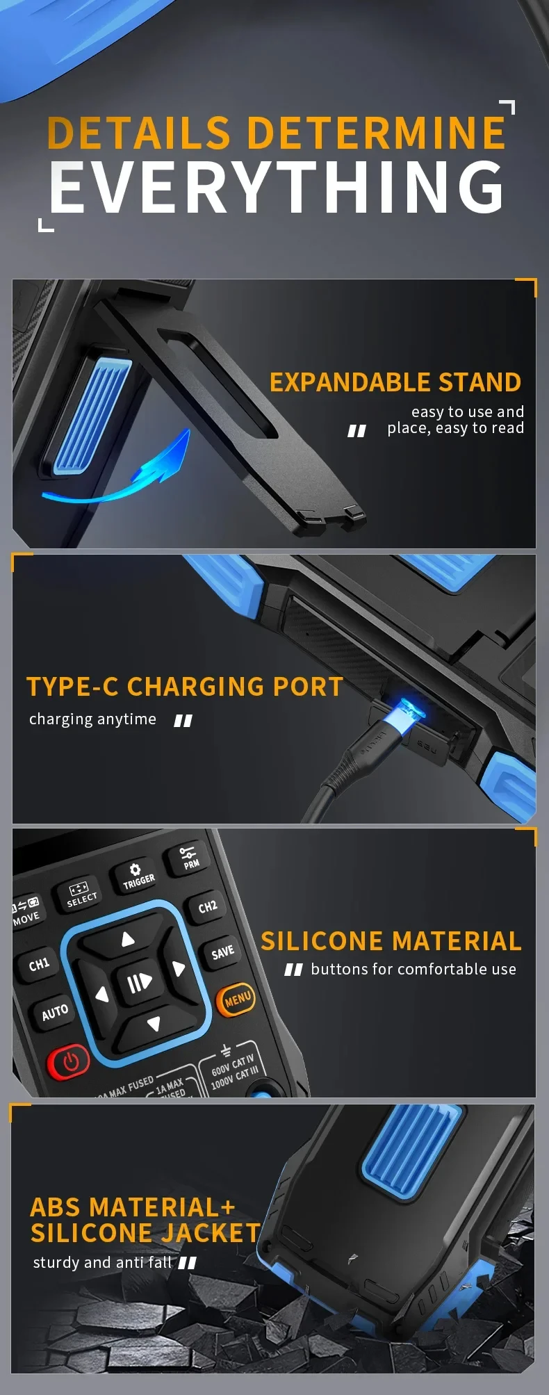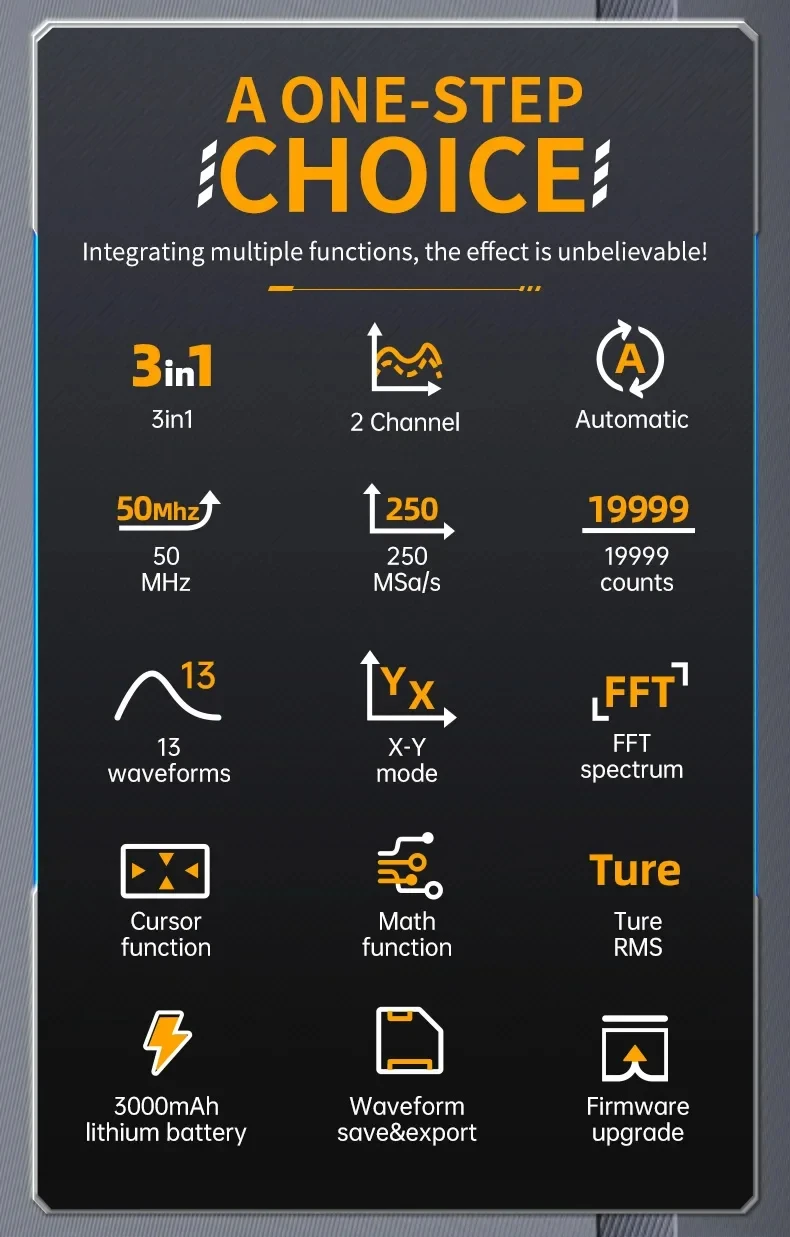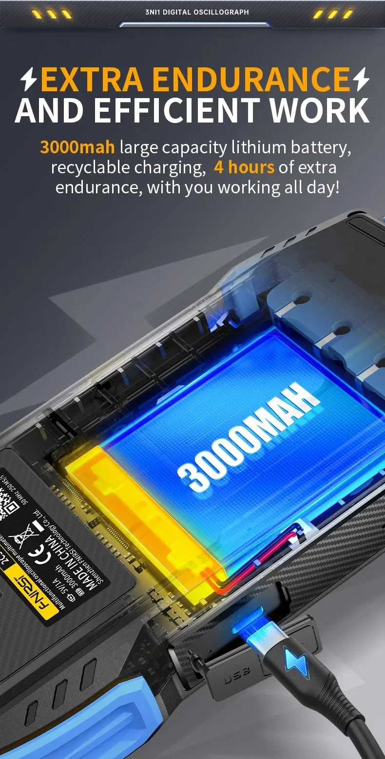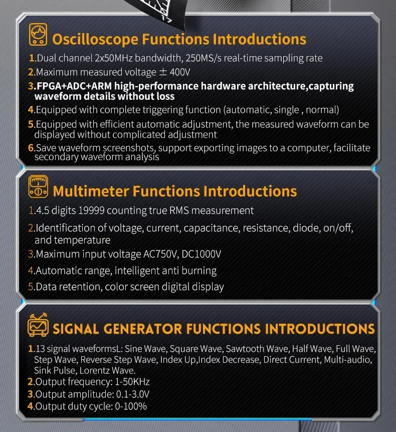 This device is equipped with three main functions of oscilloscope, multimeter, and signal generator.